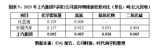 考慮到企業(yè)的經(jīng)營規(guī)模不同,除了污染物指標(biāo)的實(shí)際排放量外,我們計算出企業(yè)的廢棄物排放密度。如圖表5所示,從上述廢棄物排放密度(實(shí)際排放量/營收)來看,上汽集團(tuán)在同行業(yè)公司中處于領(lǐng)先水平。