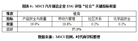 但對于汽車制造行業(yè),MSCI更注重企業(yè)在社會責(zé)任、公司治理方面的表現(xiàn)。如在MSCI的ESG評級行業(yè)指標(biāo)權(quán)重中,環(huán)境、社會、治理維度的各項權(quán)重分別為29.1%、37.1%、33.9%。