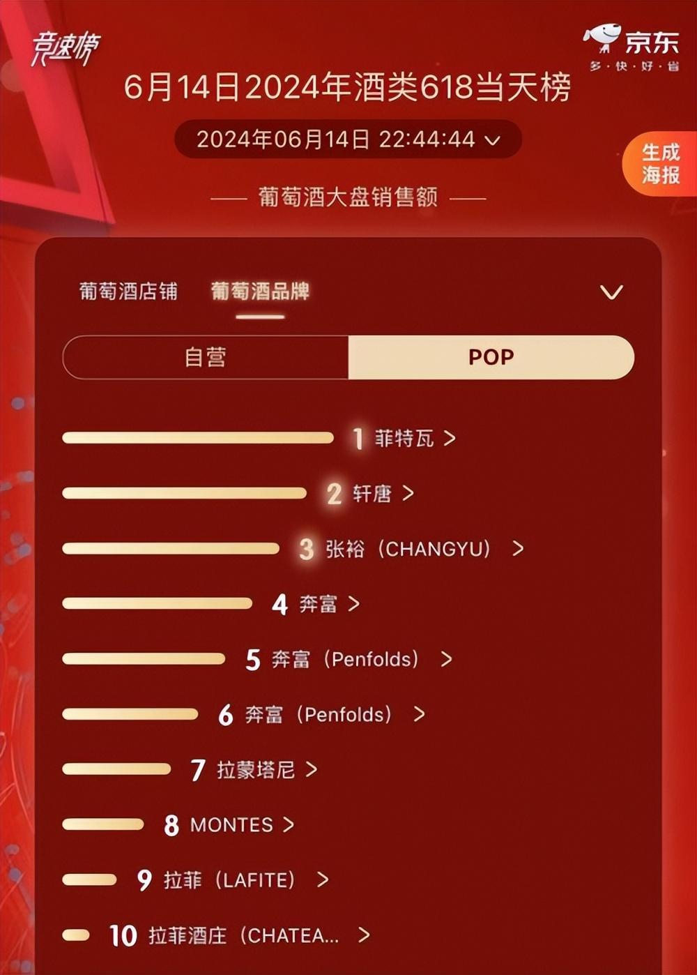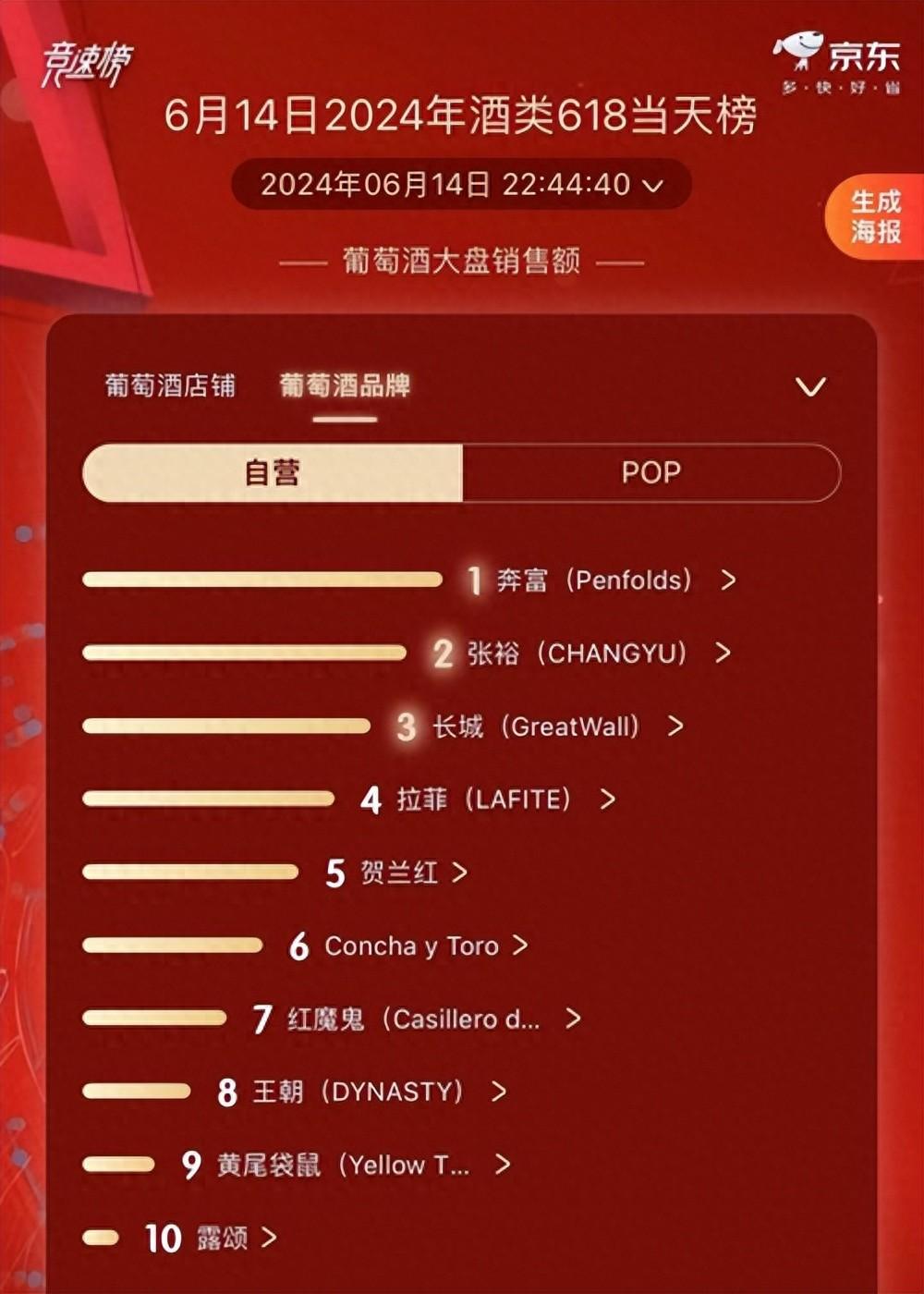 今年618期間,京東超市葡萄酒則迎來了新一輪消費高峰。6月15日,京東超市發布酒類618葡萄酒銷售額競速榜單,6月14日當天榜單數據顯示,奔富、張裕、長城成為葡萄酒自營品牌銷售額前三名,消費者耳熟能詳的“拉菲”則名列第四。