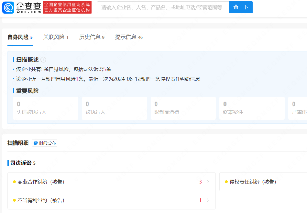 企查查還顯示,目前,合眾易寶共有5條自身風險,包括司法訴訟5條。最近一次為2024年6月12日新增一條侵權責任糾紛信息,被告包括中國太平洋財產保險股份有限公司呼和浩特中心支公司 、內蒙古沁青城旅游管理有限公司、武漢合眾易寶科技有限公司、賽罕區青城樂水旅游景區管理服務中心。案由為公共場所的管理人或者群眾性活動的組織者,因未盡到安全保障義務致人損害所產生的糾紛。