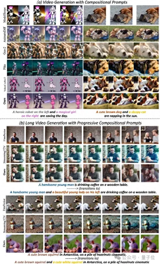 這個框架不僅能夠直接增強現有模型的組合生成,還能夠支持涵蓋多復雜指令、多場景變更等更高難度的長視頻生成。