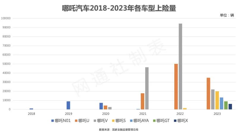 2022年,張勇開始帶領哪吒汽車向上攀登。根據(jù)國家金融監(jiān)督管理總局數(shù)據(jù),哪吒汽車2021年和2022年上險量最高的車型是哪吒V。在決定逐漸弱化10萬元以下低端市場后,2023年哪吒汽車上險量最高的車型成為10萬元以上的哪吒U,而哪吒V則留給B端市場和海外市場。