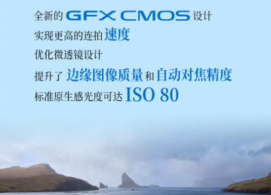 富士 GFX100SⅡ 無反相機搭載 1.02 億像素的中畫幅傳感器,使用 GFX COMS 設計,官方表示“提升了邊緣圖像質量和自動對焦精度,標準原生感光度可達 ISO 80”。