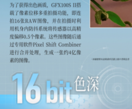 GFX100SⅡ 搭載像素位移多重拍攝功能,可連拍 16 張 RAW 圖像,在拍攝時,相機可利用防抖系統(tǒng)將傳感器以高精度偏移 0.5 個像素,通過軟件 Pixel Shift Combiner 合并處理,可生成一張約 4 億像素圖像。