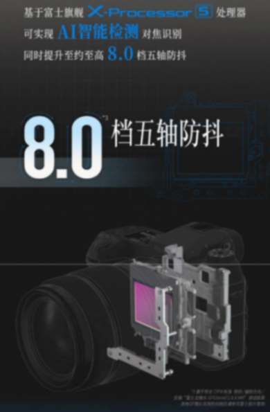 該相機搭載 X-Processor 5 處理器,支持 AI 智能檢測對焦,可提升至約 8.0 檔五軸防抖(最高)。