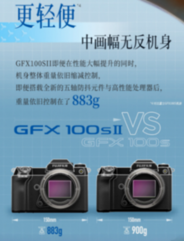 GFX100SⅡ 重量約 883g,機身寬度約 150mm,對比 100S,減重約 17g。