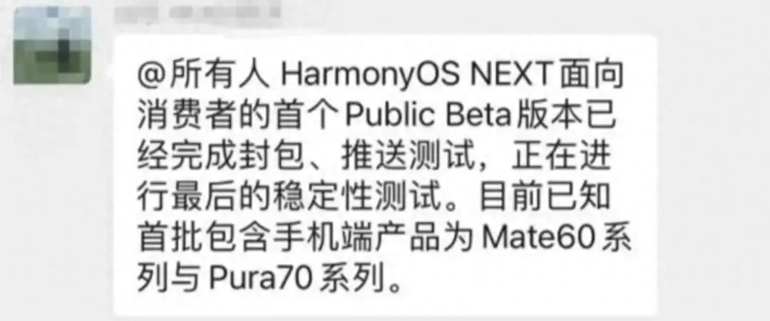 “HarmonyOS NEXT面向消費者的首個Public Beta版本已經完成封包、推送測試,正在進行最后的穩定性測試。目前已知首批包含手機端產品為Mate60系列與Pura70系列。”