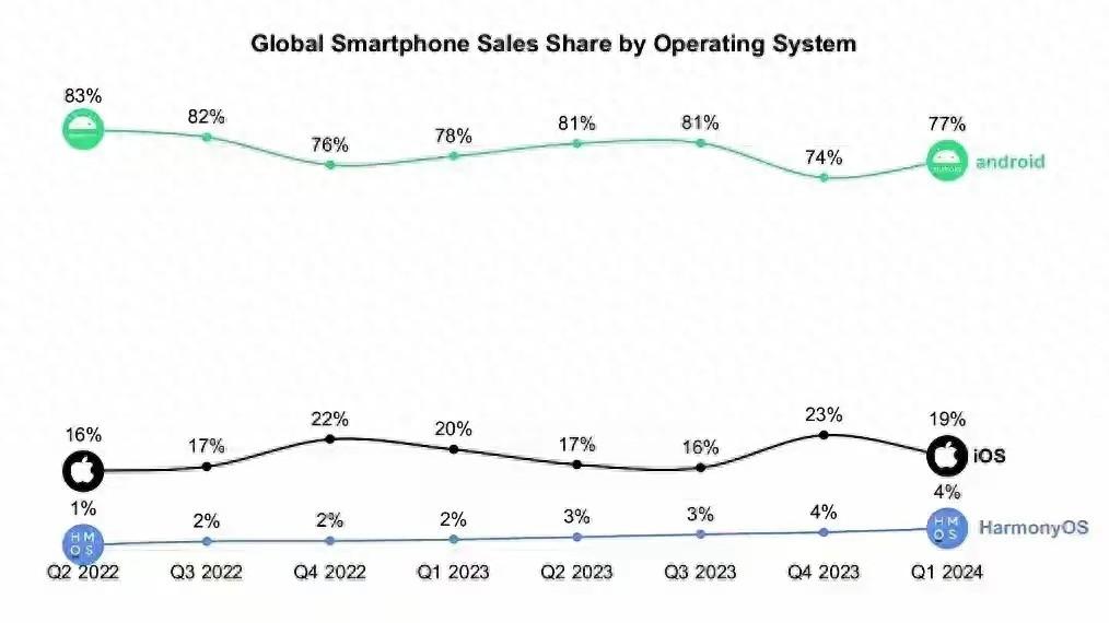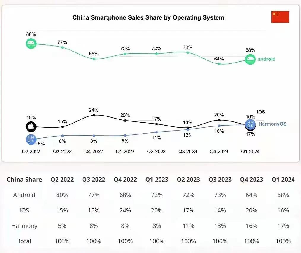 近日,#鴻蒙份額超越 iOS#登上社交平臺熱搜。Counterpoint Research 數據顯示,2024 年第一季度,華為鴻蒙 HarmonyOS 在中國市場首次超越蘋果 iOS,成為國內第二大操作系統。鴻蒙份額從 8%漲至 17%,iOS 則從 20%降至 16%,這是 iOS 自 2019 年一季度以來首次在第一季度下滑,源于華為 5G 手機的競爭。