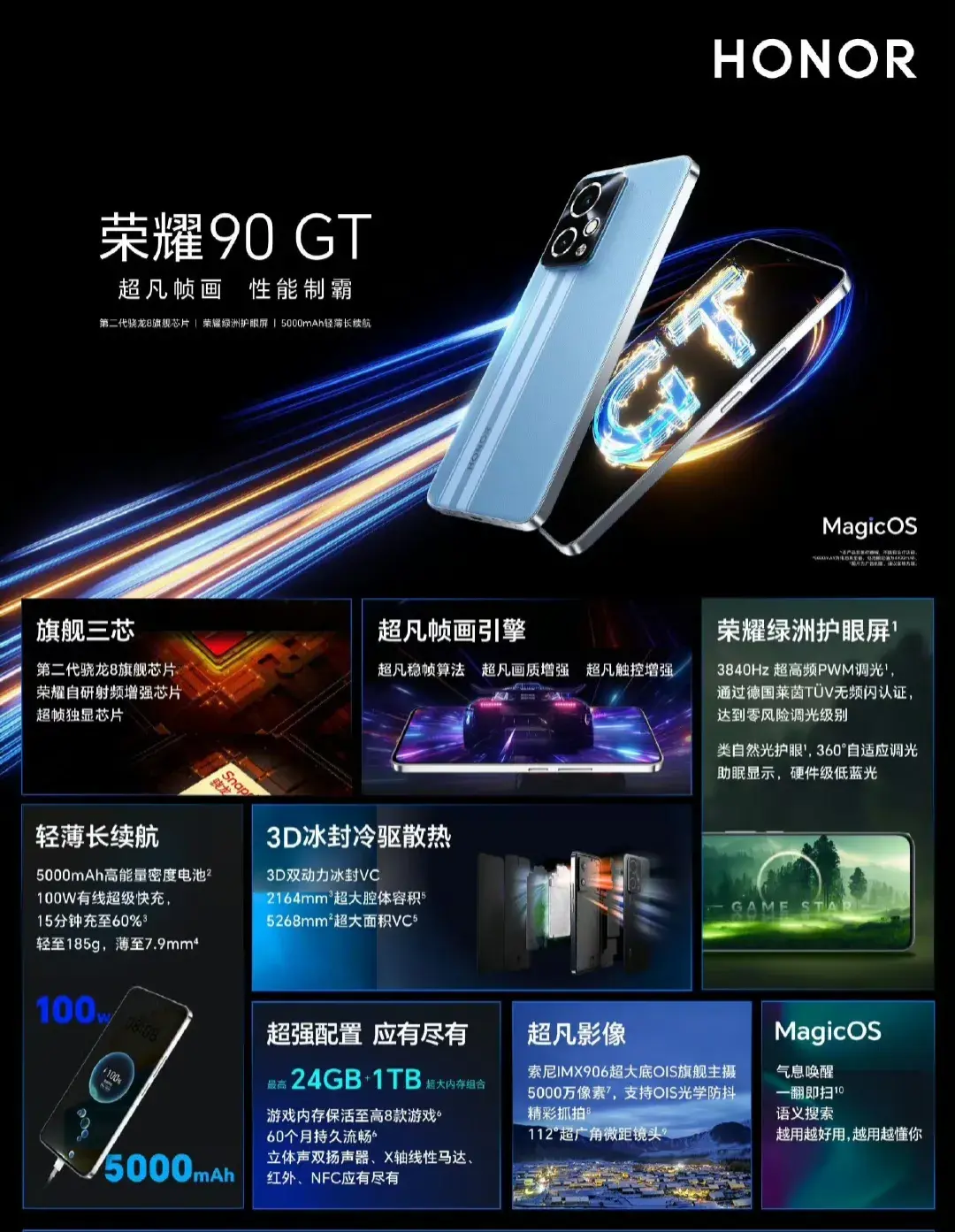 榮耀90GT 號稱性能滅霸,因為搭載旗艦三芯:第二代驍龍8+自研射頻增強芯片+超幀獨顯芯片。擁有超凡幀畫引擎,打游戲很強。