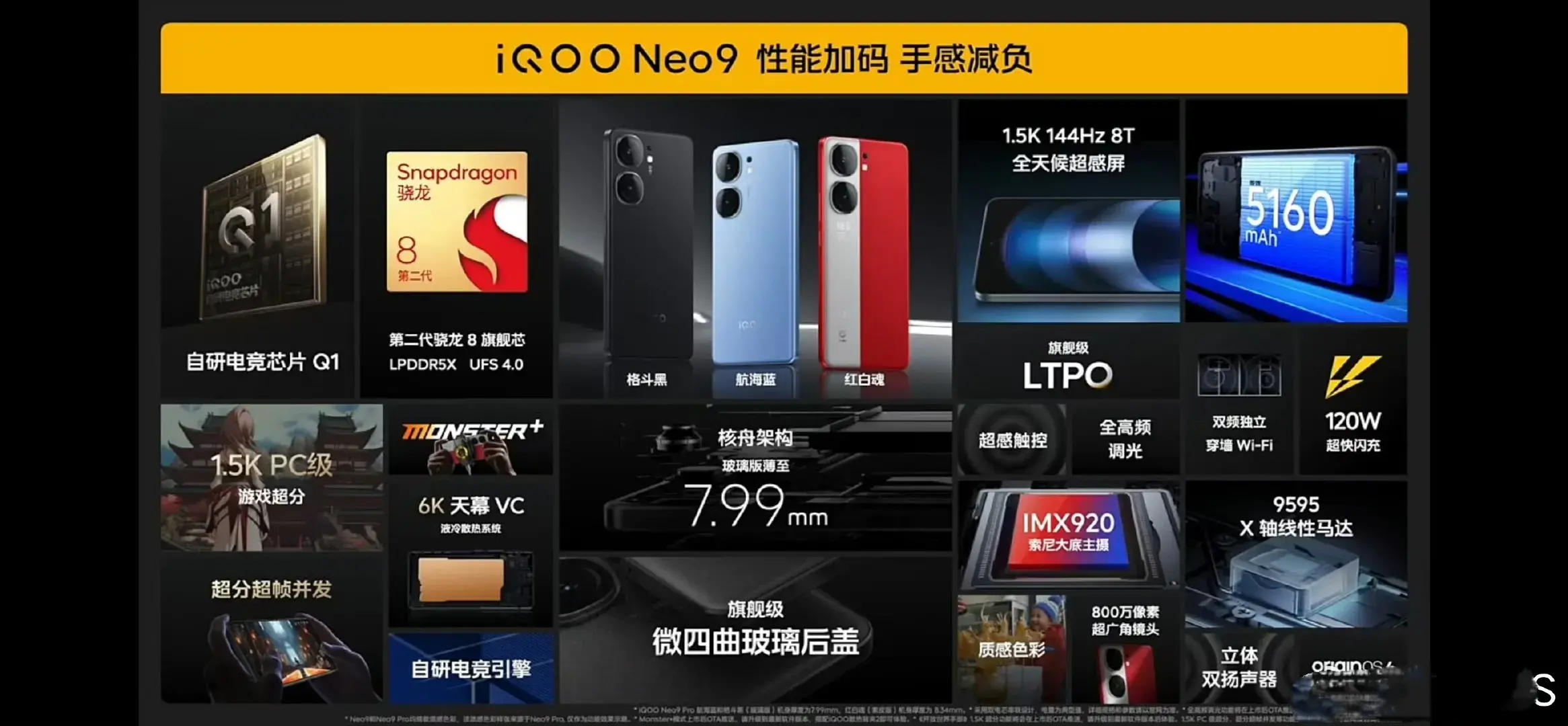 iQOO Neo9搭載第二代驍龍 8+自研電競芯片Q1,游戲體驗滿分。塑料中框+玻璃/素皮后蓋。