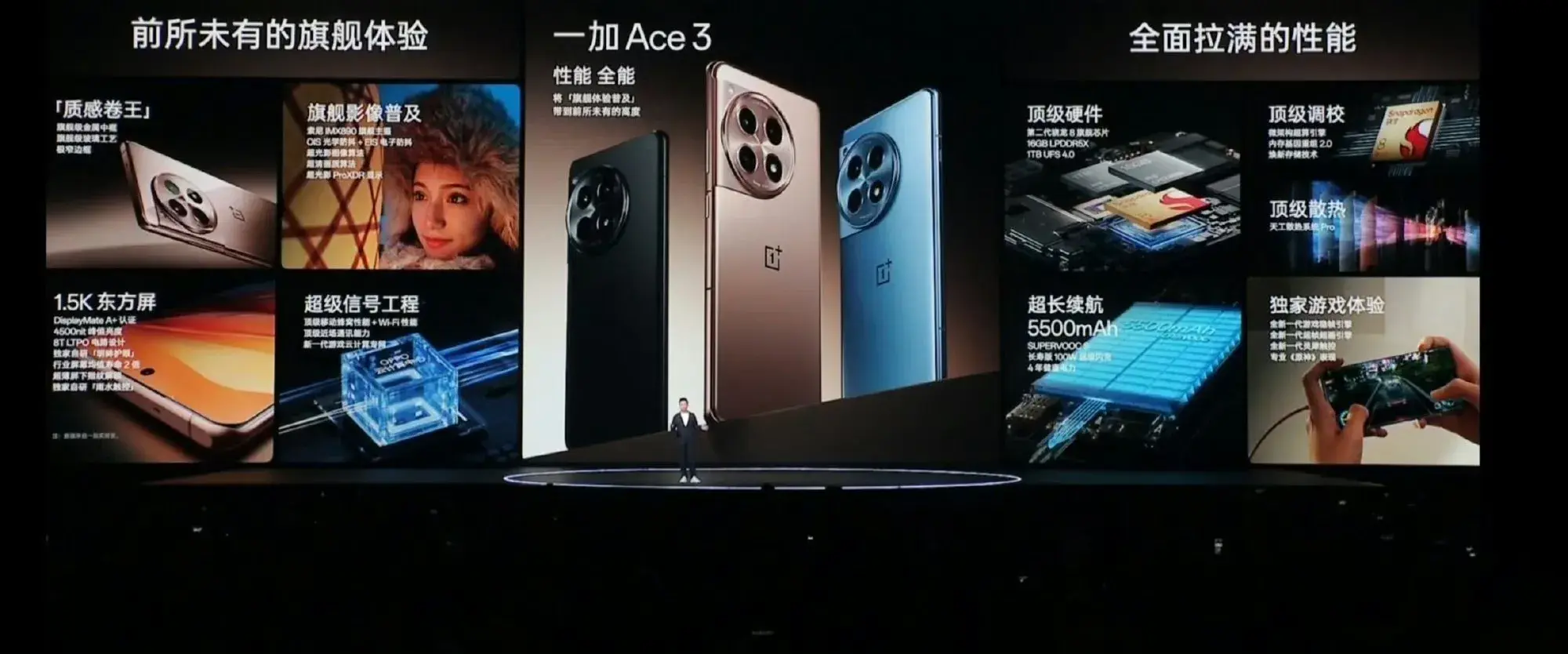 一加 ACE3 是一款曲面屏手機,搭載第二驍龍8處理器+獨顯芯片,金屬中框+玻璃后蓋設計。一加獨有三段式按鍵。