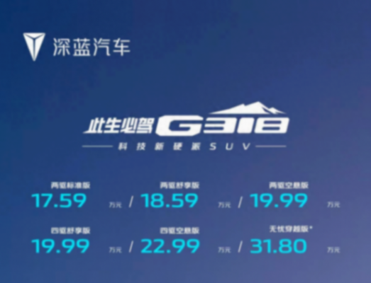 剛剛,深藍(lán)G318在拉薩正式上市。具體來看,深藍(lán)G318共六款車型,售價(jià)從17.59萬到31.80萬元。其中,售價(jià)在31.80萬元的頂配“無憂穿越版”目前是開啟預(yù)售狀態(tài),預(yù)計(jì)2025年開始交付。那么這款車到底怎么樣?哪個(gè)版本更值得買呢?今天我們就來分析一番。