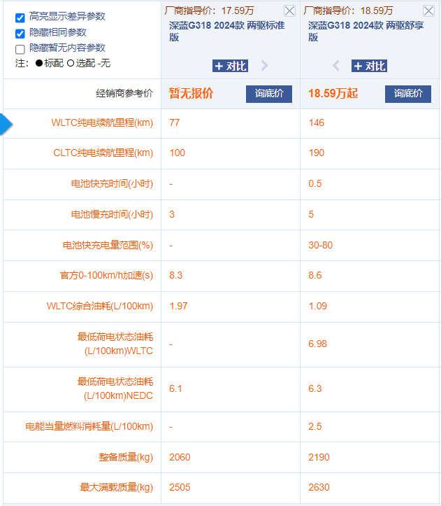 我們先來看標(biāo)配與中配,兩款車型最為明顯的差別就在于續(xù)航上。標(biāo)準(zhǔn)版CLTC工況純電續(xù)航100km,舒享版則在190km,而且舒享版的這個(gè)純電續(xù)航里程,也是全系最長的。這主要是由于兩款車次用的電池能量密度不同,標(biāo)準(zhǔn)版電池密度為18.99kwh,舒享版則為35.07khw,差了將近一半。除此之外,兩驅(qū)標(biāo)準(zhǔn)版并不支持快充,只有慢充。