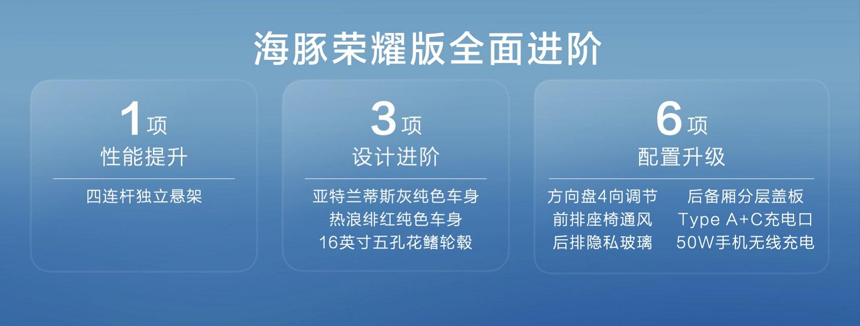動力方面,比亞迪海豚榮耀版提供70千瓦和130千瓦兩種功率的輸出電機,最大扭矩分別為180N·m和290N·m。新車除了保留了401km和420km續航外,還新增了302km續航的入門版車型。除此之外,海豚榮耀版全系車型后懸架升級為四連桿獨立懸架,進一步提升操控性和舒適性。