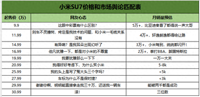 小米SU7遲遲未公布價格,給一眾網友都急壞了。今天我們就盤點一下,坊間對于小米SU7的價格預測,以及對應的心態,還有相應的月銷量預測。
