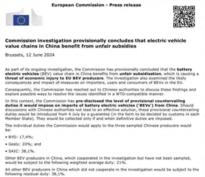 6月12日,歐盟委員會(huì)發(fā)布擬從7月4日開始對進(jìn)口自中國的電動(dòng)汽車征收臨時(shí)反補(bǔ)貼稅,對目前中國汽車出口規(guī)模最大的上汽集團(tuán)加征最高38.1%的關(guān)稅。