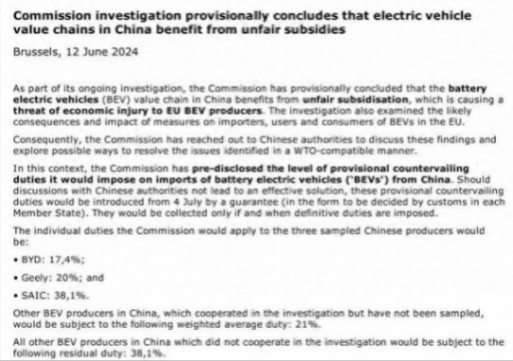 6月12日,歐盟委員會發(fā)表聲明,擬從7月4日起對從中國進口的電動汽車征收臨時反補貼稅。這一消息旋即在汽車界產(chǎn)生了巨大的轟動。