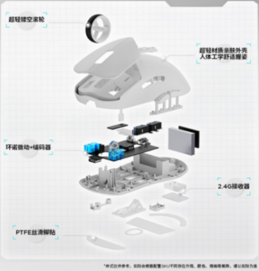 該鼠標(biāo)內(nèi)置 450mAh 電池,搭載 PAW3395 傳感器,DPI 范圍 100-26000,追蹤速度 650ips,加速度 50g。