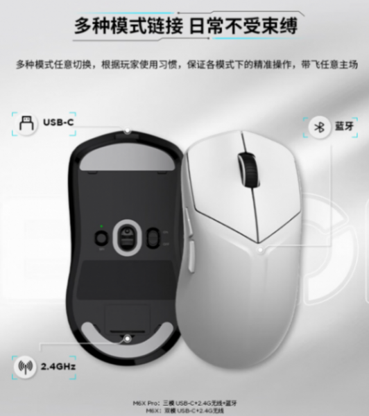 聯(lián)想拯救者 M6X Pro 支持有線 / 藍(lán)牙 / 2.4G 三模連接,內(nèi)置板載天線,可提供約 10 米距離無線傳輸。