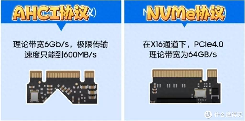 數據協議:協議規定了數據的格式、解碼方式和通訊方法等,常見協議有AHCI和NVMe這兩種,SATA總線用AHCI協議,PCIe總線用NVMe協議。