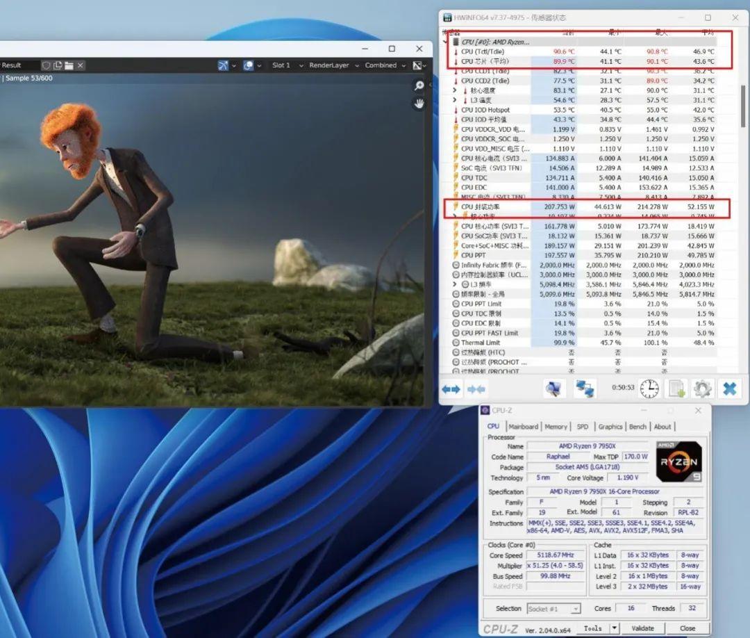 ▲銳龍9 7950X在進行實際的Blender圖形渲染時,處理器封裝功耗也只有207W。