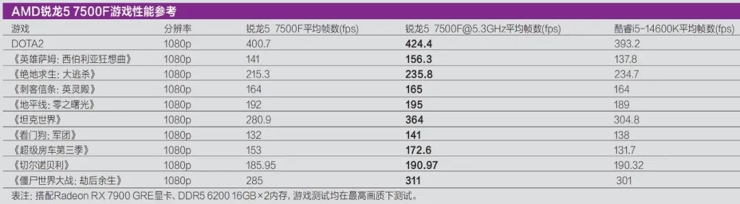 游戲性能方面,在都使用Radeon RX 7900 GRE顯卡的10款游戲測試中,銳龍5 7500F在默認頻率下與酷睿i5-14600K的游戲性能對比是互有勝負。不過銳龍5 7500F還擁有不小的超頻潛力,當其超頻到全核心5.3GHz后,銳龍5 7500F能在10款游戲中全部超越默認頻率下的酷睿i5-14600K,而后者的售價比它高了1000元以上。