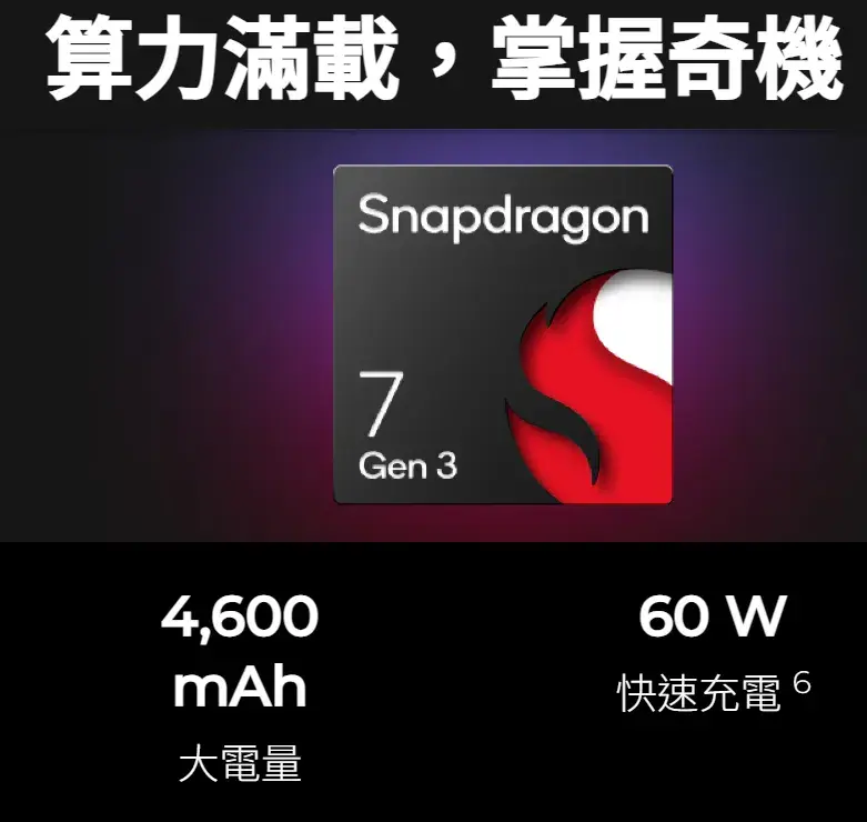 核心配置上,新機采用了驍龍 7 Gen3 平臺,官方號稱 “ 算力滿載 ” 。
