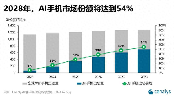 事實(shí)卻是如此,根據(jù)市場調(diào)研機(jī)構(gòu)Canalys的一份報(bào)告顯示,AI手機(jī)正在重新定義和引領(lǐng)手機(jī)市場,其預(yù)計(jì)2024年,AI手機(jī)能夠占據(jù)出貨量的16%,2028年的出貨占比更是能突破54%,成為超過半數(shù)的市場主流。