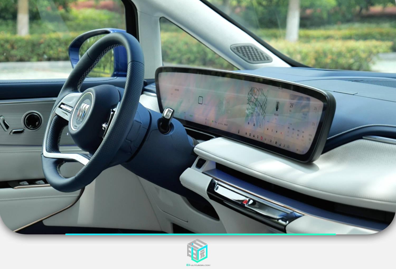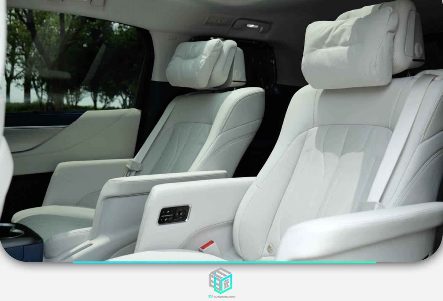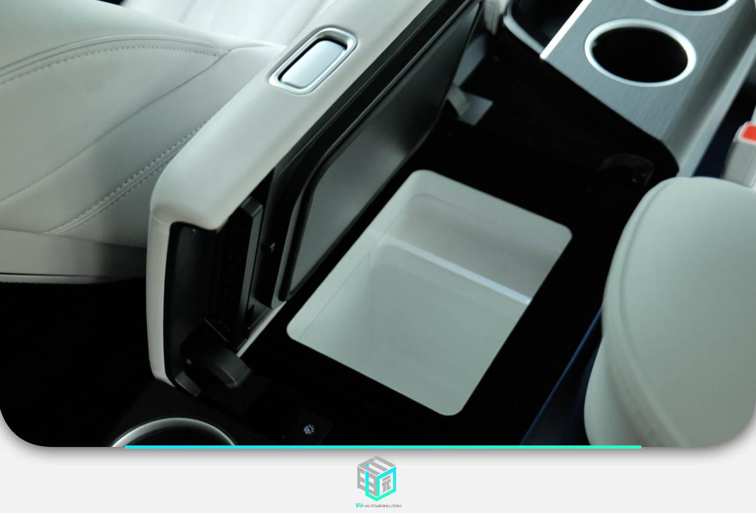 車內采用了藍白色的配色,是目前新能源車型上很主流的搭配方案。車內大面積采用Nappa真皮材質,觸感出色,另外在配置上,這臺車也是向新勢力品牌看齊,冰箱彩電大沙發一應俱全。前排還設計了可電動滑動的中央島臺,提升了實用性。