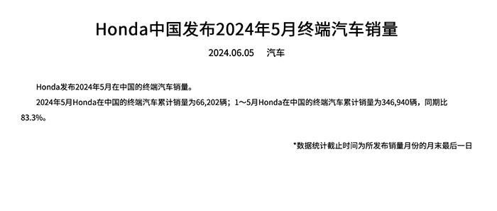 根據本田中國發布的5月銷量快報顯示,5月份單月本田在華累計銷量6.62萬輛,另外其前5個月累計銷量達到34.69萬輛,同比下滑16.7%。根據上述數據可以看到,東風本田以及廣汽本田目前月銷量已經在3~4萬輛月均銷量左右徘徊,這一數據較2020-2023年在華銷量數據,已經下降了接近一半兒。