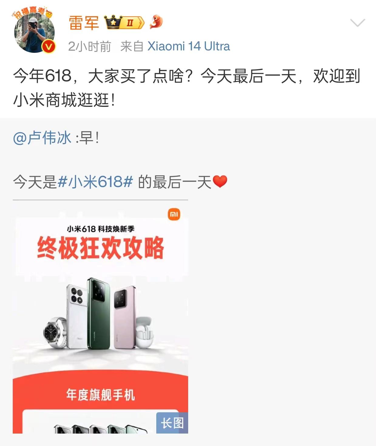 雷軍今天一大早就提醒大家今天是618最后一天,歡迎到小米商城逛逛。小米商城的產品算是非常豐富了,不止是手機電腦電視,還有很多產品,幾乎都有,大家想要的都能買到。其實如果大家方便的話,到小米之家逛逛更好,畢竟實物看著更好一些,不會太需要腦補。這個咋說呢,比如一款手機的顏值,很多時候網上的圖片是顯示不出來的,有的手機圖片比真機好看,有的手機圖片沒有真機好看,所以還是建議大家有空就直接去線下體驗店體驗一下,當然如果沒有時間,加班之類的,那就在網上也也行,最壞打算就是退了唄,也沒有損失。