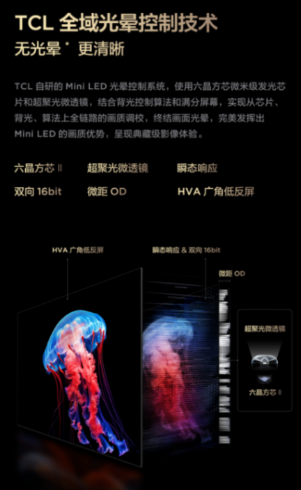 之所以Q10K電視不會出現這種情況,是因為電視搭載了TCL全域光暈控制技術。這項技術由六晶方芯II、超聚光微透鏡、背光響應算法、微距OD值和HVA廣角低反屏組成。