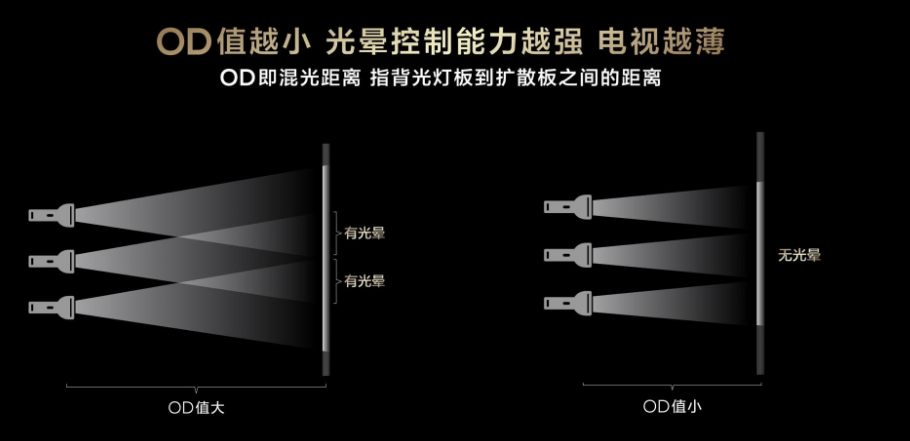這里的OD值我上網查了一下,指的是背光燈板到擴散板的距離,距離越小,光暈越好控制。相當于手電筒往墻上打光,距離越近,光斑越亮,邊緣越清晰。