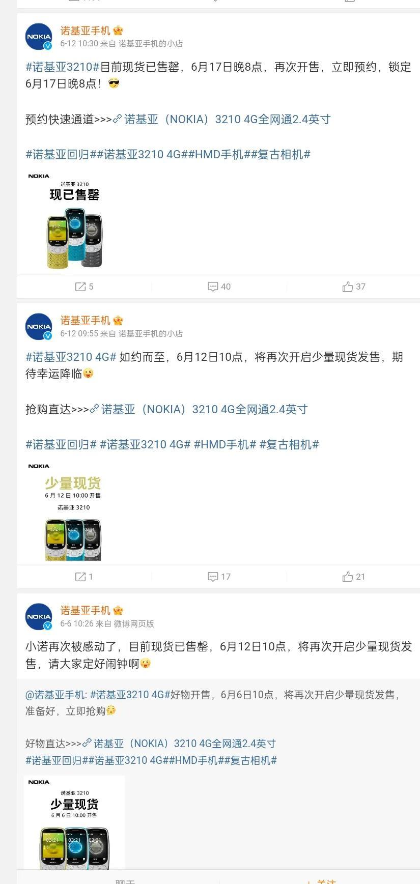 諾基亞官方微博一次次發(fā)文,3210售罄。