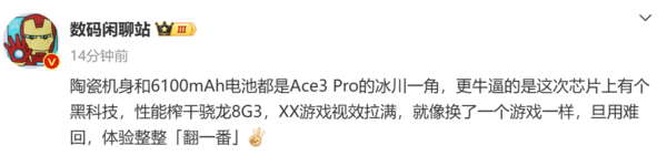 該博主稱,陶瓷機身和6100mAh電池都是一加Ace3 Pro的冰川一角,更厲害的是這次芯片上有個黑科技,性能榨干驍龍8 Gen3,有游戲的視效拉滿,就像換了一個游戲一樣,旦用難回,體驗整整“翻一番”。該博主還在評論區透露,這個功能的實現主要靠哲庫,芯片端也做了更高一檔的GPU性能釋放。不過其同時表示,哲庫并沒有復活,這只是哲庫團隊的遺產。