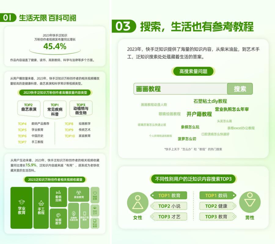 泛知識搜索,也處處蘊藏著生活的答案。針對“畫畫教程”“開戶籍教程”“營業(yè)執(zhí)照怎么年審”等高搜索量問題,快手泛知識在2023年提供海量知識內容,從柴米油鹽到藝術手工,極具市井煙火氣和生活智慧的創(chuàng)作層出不窮。各式搜索中,教育和數碼相關內容備受青睞,分別成為女性和男性的TOP1搜索。