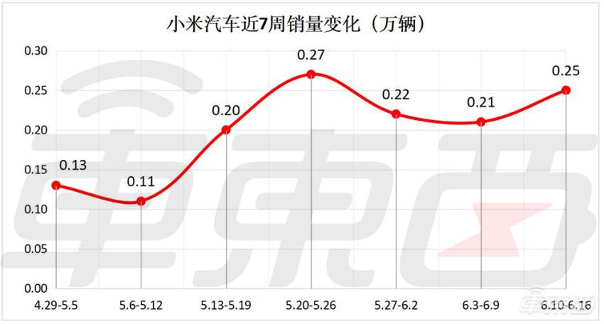 2024年第24周(6.10-6.16)小米汽車周銷量為0.25萬輛,排名第七,排在小米后面的分別是小鵬、騰勢、智己。