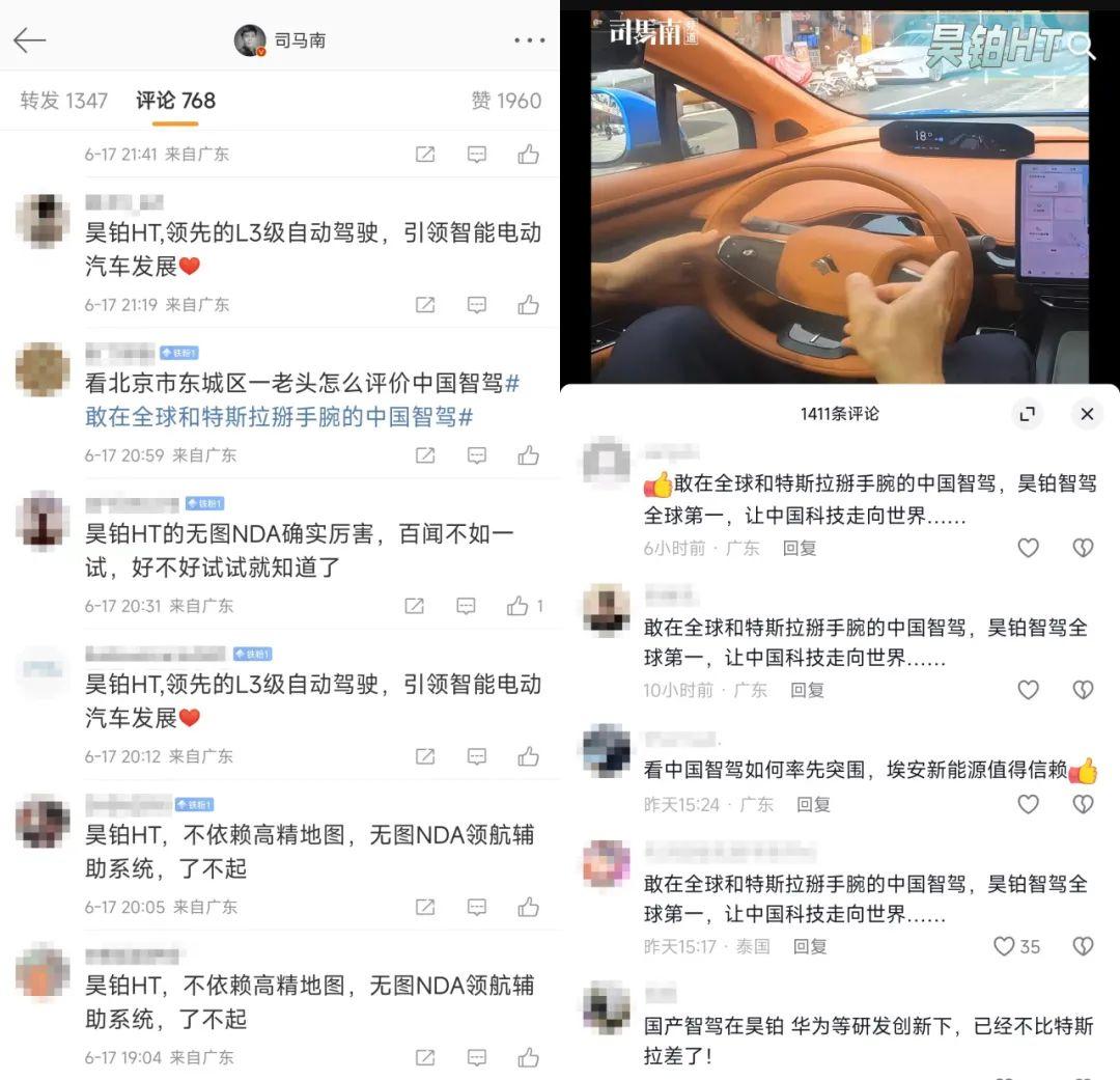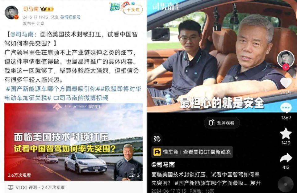 6月17日,在抖音和微博(09898.HK)分別擁有3647.9萬和322.8萬粉絲的大V司馬南,發布了題為“面臨美國技術封鎖打壓,是看中國智駕如何率先突圍”的視頻,為廣汽(601238.SH,02238.HK)埃安旗下新昊鉑HT造勢。該視頻24小時內在微博播放量2.4萬,抖音收獲2.3萬贊,以平臺普遍3%的點贊率測算,該視頻播放量約80萬。