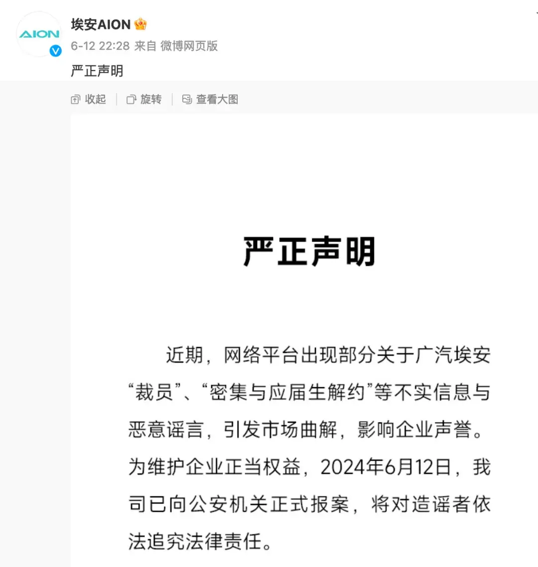近日,網(wǎng)絡(luò)上有消息稱“廣汽埃安將裁員20%”、“廣汽埃安密集與應(yīng)屆生解約”。針對(duì)以上不實(shí)信息,廣汽埃安反應(yīng)迅速,不但采取報(bào)案措施,而且還成立了廣汽埃安網(wǎng)絡(luò)舉報(bào)中心。種種措施表明,廣汽埃安要加大力度粉碎謠言,以正視聽(tīng)。
