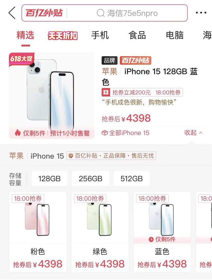 蘋果618銷量成績好嗎?確實(shí)很好,但這是用降價(jià)換來的。以iPhone 15 128GB版為例,天貓到手價(jià)為4599元,比蘋果官網(wǎng)定價(jià)低了1400元;京東iPhone 15 128GB版到手價(jià)為4749元,PLUS會(huì)員折上折,到手還能再省40元;輪到勢頭正猛的拼多多,iPhone 15 128GB版到手價(jià)為4398元。