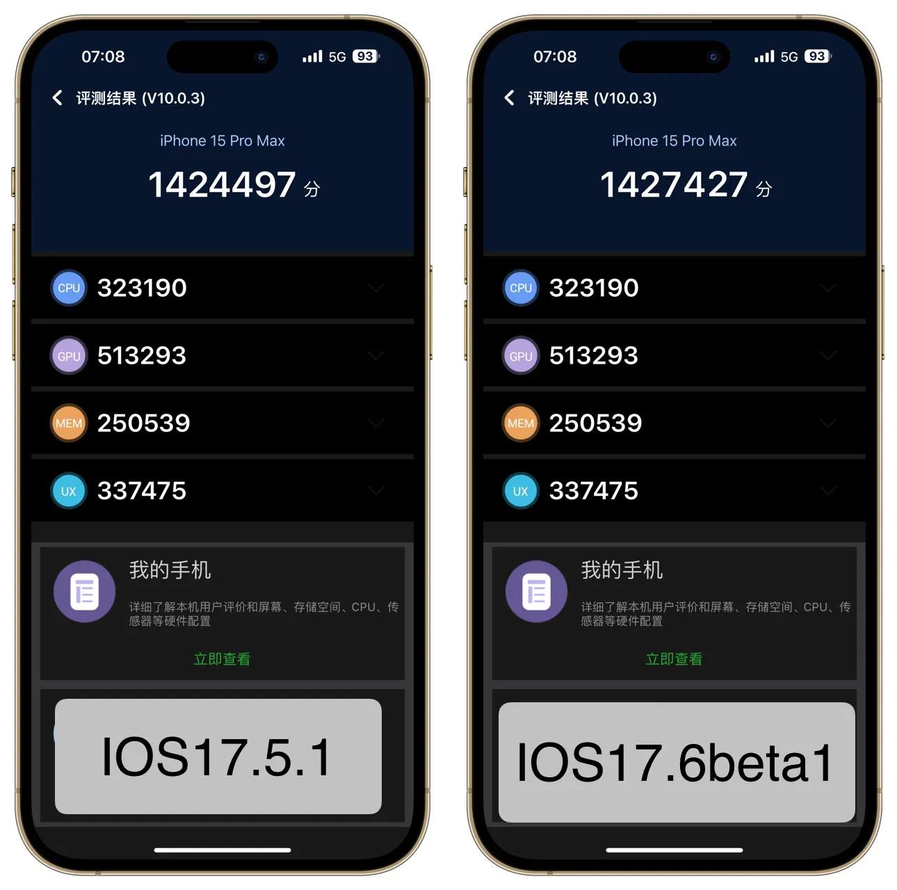 按照慣例,我第一時間將其中一臺15PM升級更新,另一臺保持在IOS17.5.1,然后對其進行跑分、續航、發熱測試,然后把結果分享給朋友們,朋友們可以參考參考。