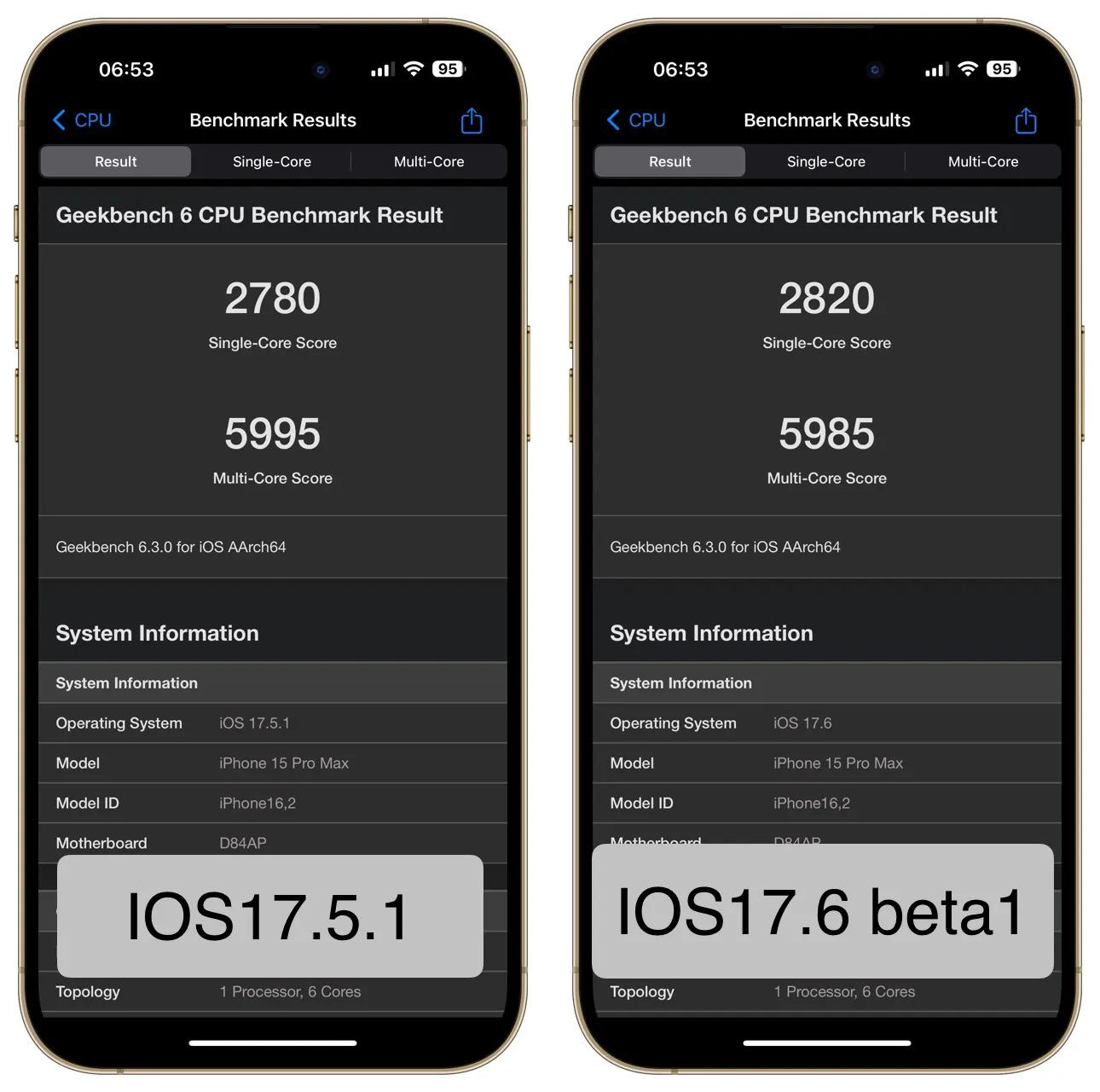 IOS17.6 beta1的跑分分值略有提升,但區別不足以說明17.6的性能要好一些。