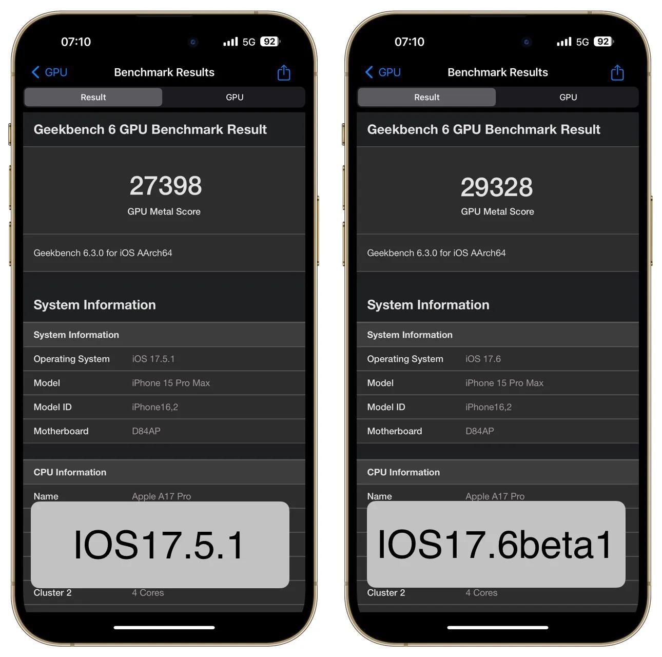 沒有想到GPU的跑分分值會有這么大的差別,為了證實不是測試環境的影響,同等條件下,我又反復測試了兩三次,跑出來的分值同樣是相差很大,這結果可以說明,IOS17.6beta1的圖像處理能力有所提升。