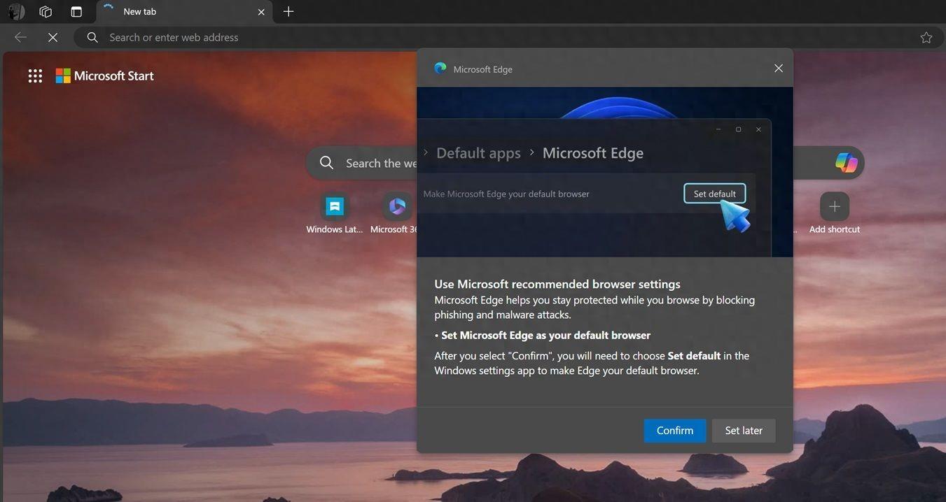 該媒體表示微軟已經(jīng)測試該 3D 橫幅一段時(shí)間了,現(xiàn)在開始向更多用戶推送。如果 Edge 并非用戶的默認(rèn)瀏覽器,用戶直接打開 Edge 或者通過 PDF 等文件打開 Edge 瀏覽器之后,會(huì)跳出新的橫幅,推薦用戶將其設(shè)為默認(rèn)瀏覽器。