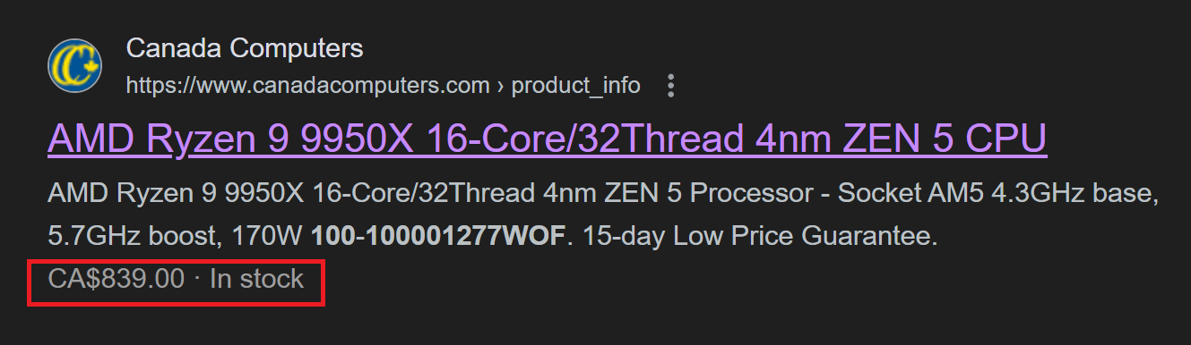 具體而言,加拿大Canada Computers公布的Ryzen 9 9950X的價格為839加元(請參閱上圖),約610美元。那么,這個價格到底是高是低?性價比如何呢?作為參考對比,上一代Ryzen 9 7950X的最終建議零售價為699美元,將近低80美元。