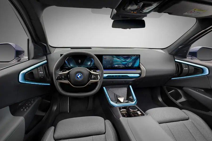 內飾方面,全新 X3 也迎來了徹底的革新,采用了由 12.3 英寸儀表盤和 14.9 英寸觸摸屏組成的曲面顯示屏。駕駛員可以通過全新樣式的方向盤控制儀表盤,該方向盤與新款 3 系和 5 系相同。中控屏幕下方則配備了帶觸控功能的照明面板,用于控制一些關鍵功能。中控臺采用撥桿式換擋機構和 iDrive 旋鈕,以及駕駛模式、音量和泊車輔助等常用控制鍵。此外,寶馬還特別注重提升了 X3 內飾的材質品質。