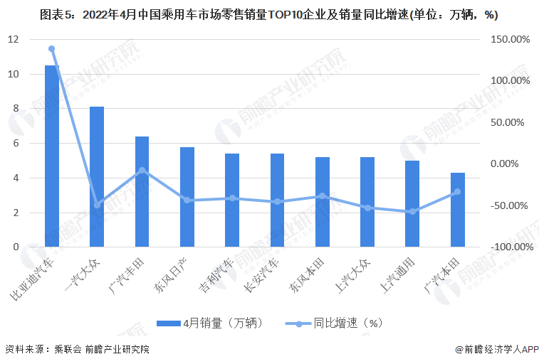 受新能源乘用車市場擴張的影響,2022年4月比亞迪汽車單月銷量首次超過一汽大眾,登頂中國乘用車市場零售銷量排行榜。