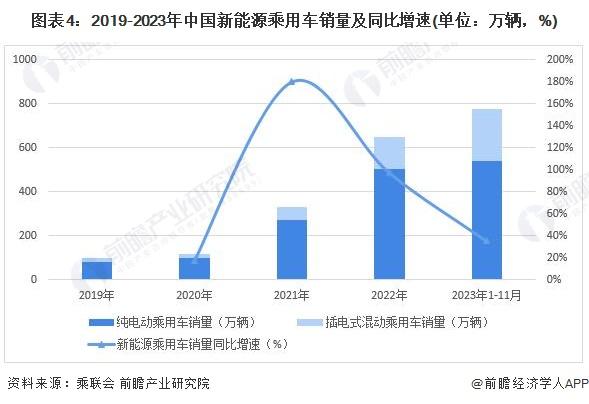 盡管中國汽車行業進入存量市場,但憑借自主品牌的內外發力和新能源汽車的一路狂飆,2019年至2022年,中國新能源乘用車的銷量也在持續增長。從新能源乘用車的銷量來看, 2022年中國新能源汽車銷量達到650萬輛,同比增長97.39%,其中,純電動乘用車銷量為501.3萬輛,插電式混動乘用車銷量為148.7萬輛。根據乘聯會的最新數據,2023年1-11月,中國新能源乘用車銷量為777.7萬輛,同比增長35.2%。