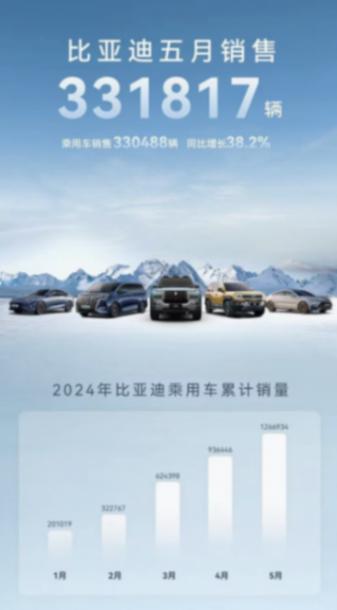 首先是比亞迪又賣爆了,5月賣出331817輛,同比大漲38.13%,環比增加3.6%,是連續第三個月月銷超過30萬輛,相當于一天賣出10703輛。