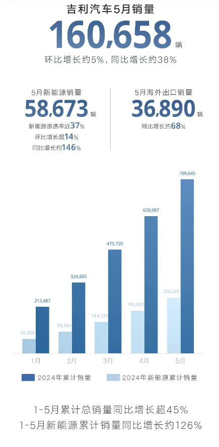 其中吉利汽車5月共交付新能源汽車58673輛,連續第二個月超過5萬輛,同比大漲117%,環比增加14.1%。